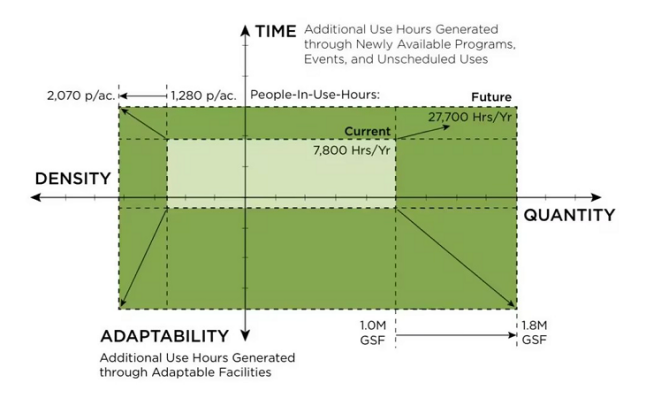 Her strategy tool synthesized existing conditions through these four dimensions, making spatial constraints and opportunities legible during committee deliberations and enabling stakeholders to compare scenarios, understand trade-offs, and align around a shared strategy for transforming the site into a highly utilized, multi-functional activity hub.