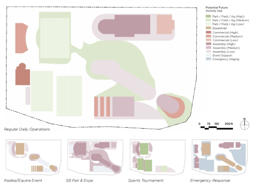 One of the major projects she contributed to, the Earl Warren Showgrounds Master Plan, is a state-level initiative commissioned by the 19th District Agricultural Association of California. The 34-acre site, positioned between Santa Barbara and the surrounding unincorporated county lands, functions not only as an event campus but also as an emergency response hub. Li supported the conceptual framework of the plan by developing diagrams, 3D visualizations, and strategic planning graphics. More critically, she helped articulate a comprehensive set of ten planning principles that established the conceptual backbone of the Master Plan. These principles—ranging from transforming the site into a highly utilized activity hub and a core node within regional systems, to centering the campus around a natural park, operating as a sustainable ecosystem, and prioritizing safe, human-scaled pedestrian movement—provided a clear and scalable framework for long-term development. Together, they enabled both the client and community stakeholders to understand how the site could incrementally evolve into a flexible, multi-functional civic asset while remaining responsive to changing social, environmental, and economic conditions.