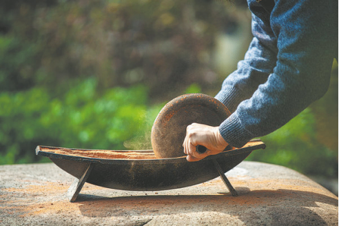 Before turning powder into paint, there are several steps, from foraging for earth pigments, to grinding and refining with water.